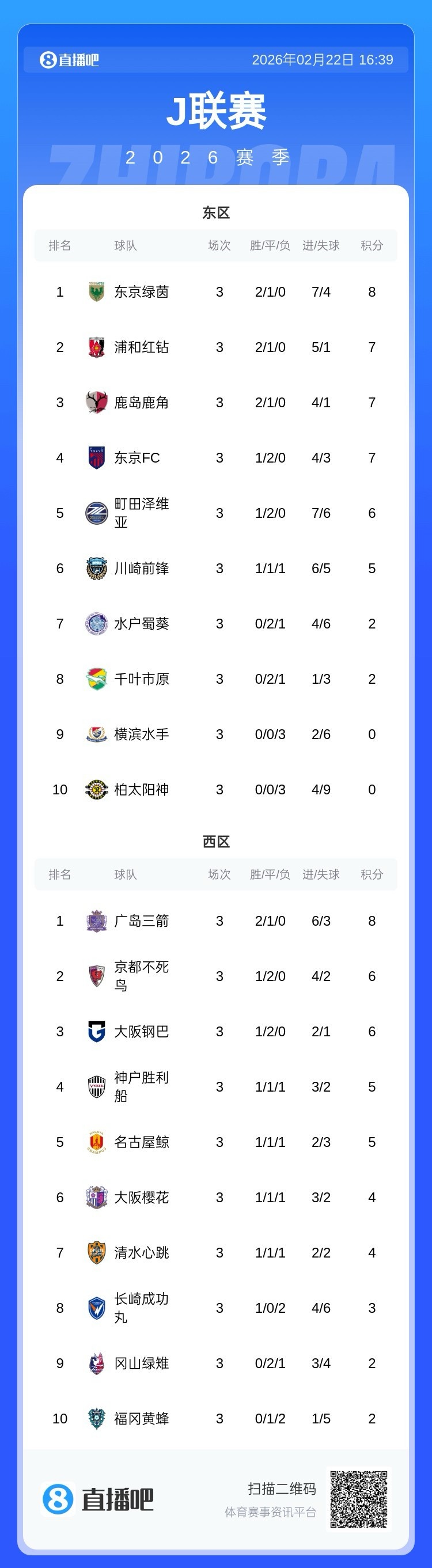 东区方面,东京绿茵点球击败町田泽维亚,开局前三场2胜1平领跑东区积分榜;浦和红钻、鹿岛鹿角取胜后分列积分榜二三位。劲旅横滨水手状态不佳,开局三连败后与同三连败的柏太阳神位居垫底位置。